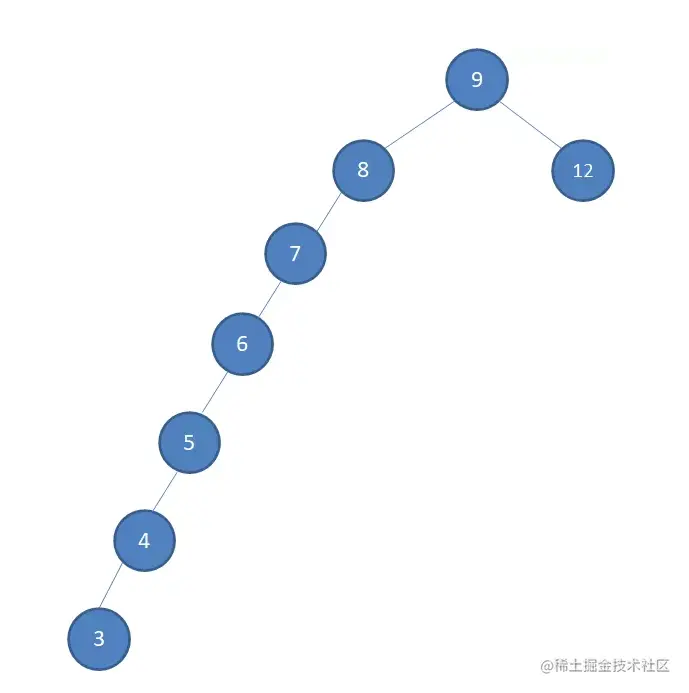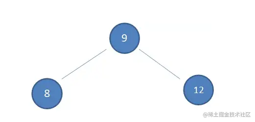 二叉查找树的缺陷例子 假设初始的二叉查找树只有三个结点,根结点值为9,左孩子值为8,右孩子值为12: