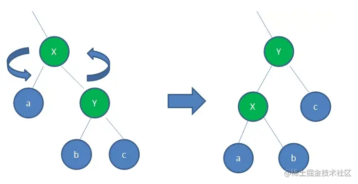 图中,身为右孩子的Y取代了X的位置,而X变成了自己的左孩子。此为左旋转。
