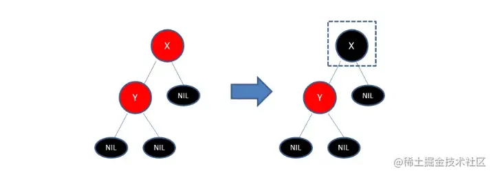 下图所表示的是红黑树的一部分(子树),新插入的结点Y是红色结点,它的父亲结点X也是红色的,不符合规则4,因此我们可以把结点X从红色变成黑色:
