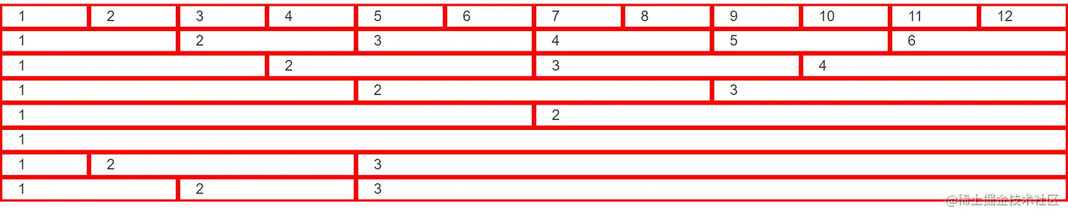 .row可以去掉该行首尾的15px槽宽。 - 栅格列:具有响应式的,超出12换行,不足12留白: