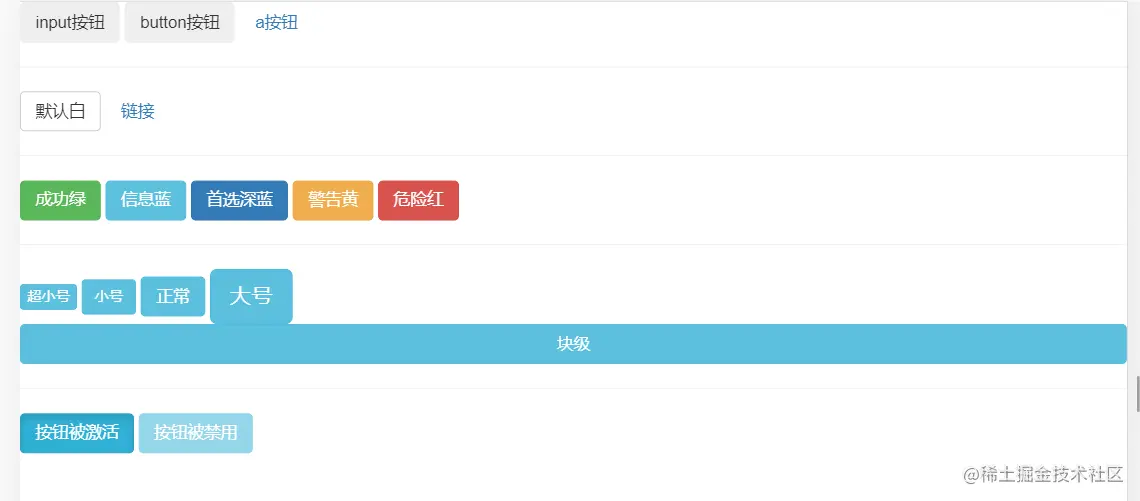 btn btn-default/link:默认白/链接。btn btn-success/info/primary/warning/danger:设置按钮颜色绿/蓝/深蓝/黄/红。btn btn-xs/sm/ml/lg/block:设置按钮为超小号/小号/正常/大号/区块。btn btn-active:激活按钮,激活时底色更深、边框颜色更深、向内投影等。btn btn-disabled:禁用按钮,禁用时鼠标经过会出现禁止图标。