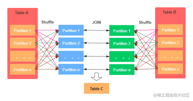 - 首先,对于两张参与JOIN的表,分别按照join key进行重分区,该过程会涉及Shuffle,其目的是将相同join key的数据发送到同一个分区,方便分区内进行join。