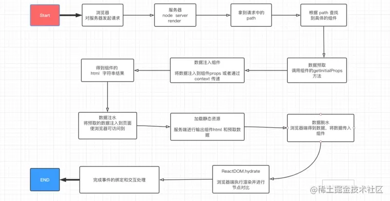 node server 接收客户端请求,得到当前的req url path,然后在已有的路由表内查找到对应的组件,拿到需要请求的数据,将数据作为 props 、context或者store 形式传入组件,然后基于 react 内置的服务端渲染api renderToString() or renderToNodeStream() 把组件渲染为 html字符串或者 stream 流, 在把最终的 html 进行输出前需要将数据注入到浏览器端(注水),server 输出(response)后浏览器端可以得到数据(脱水),浏览器开始进行渲染和节点对比,然后执行组件的componentDidMount 完成组件内事件绑定和一些交互,浏览器重用了服务端输出的 html 节点,整个流程结束。