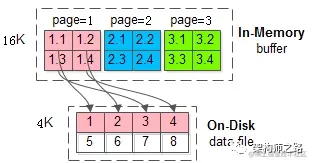 如上图所示,MySQL 里 page=1 的页,物理上对应磁盘上的 1+2+3+4 四个格。