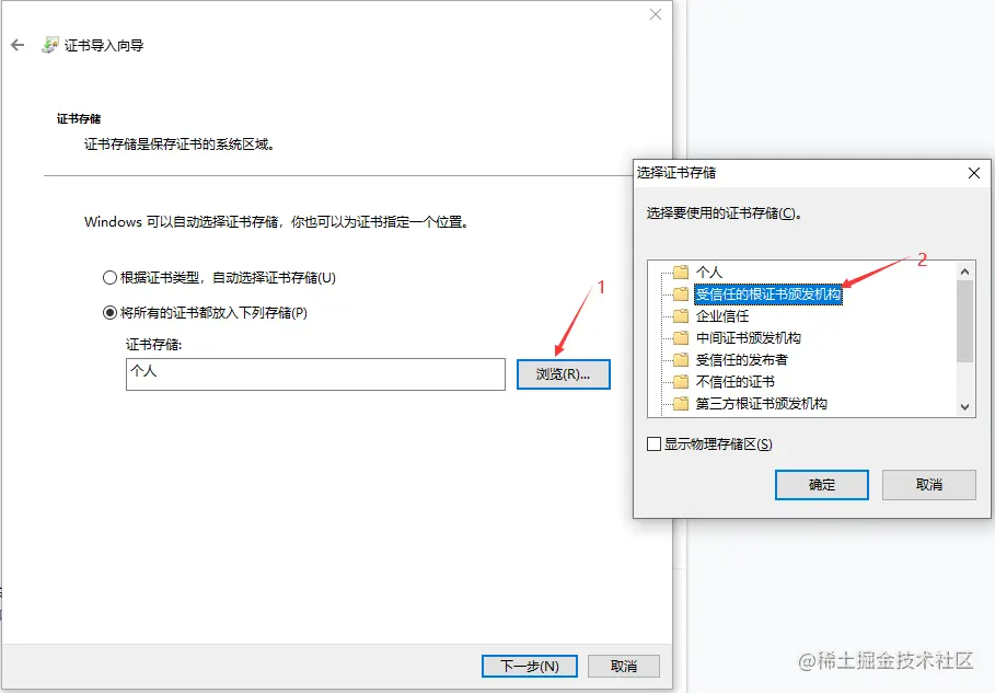 2.3 这里选择“受信任的根证书颁发机构”