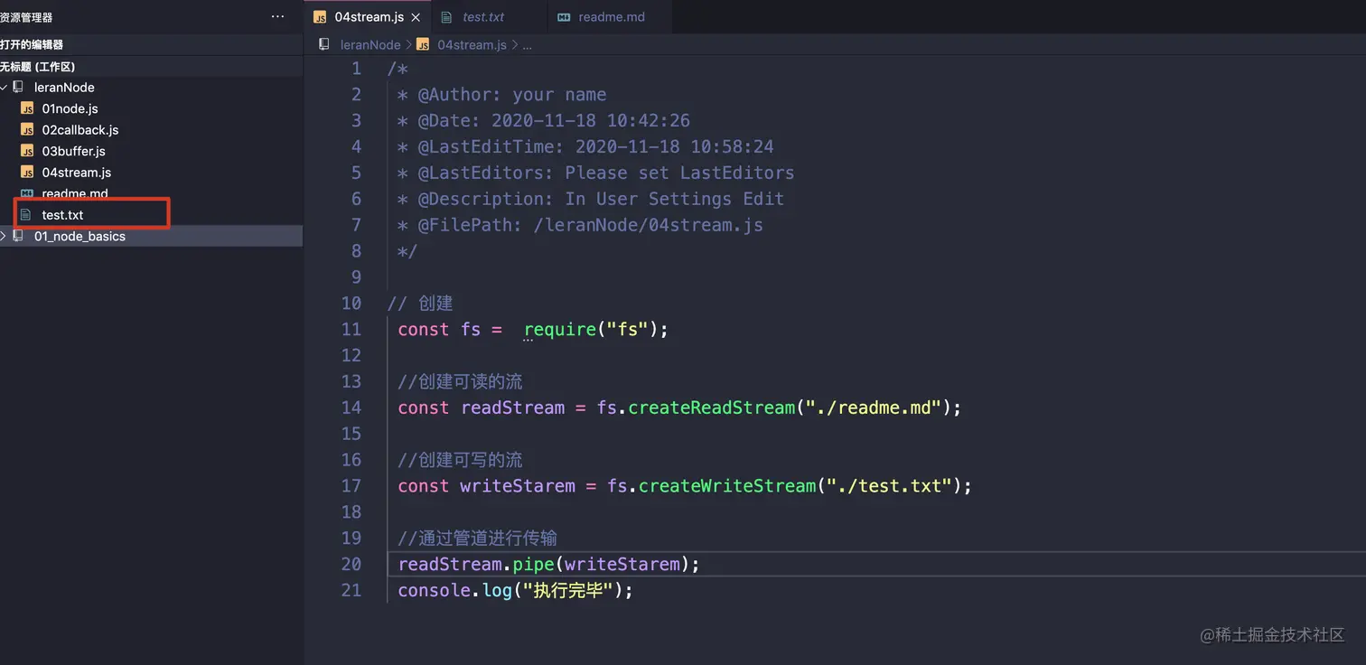 执行 node 06decompress.js 命令后,会看到文件夹中多了一个解压.txt的文件。