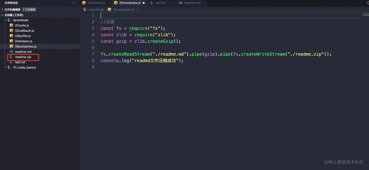 执行 node 05compress.js 命令后,会看到文件夹中多了一个readme.zip的文件。