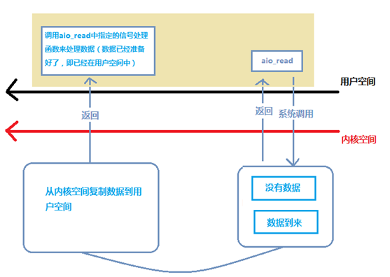 当数据到来后,操作系统自动把数据从内核空间拷贝到aio_read函数递交的用户态缓冲区。拷贝完成以信号的方式通知用户态程序,用户态程序拿到数据后就可以执行后续操作。