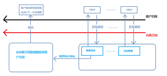 当用户进程发出read操作时,如果kernel中的数据还没有准备好,那么它并不会block用户进程,而是立刻返回一个error。从用户进程角度讲,它发起一个read操作后,并不需要等待,而是马上就得到了一个结果。用户进程判断结果是一个error时,它就知道数据还没有准备好,于是它可以再次发送read操作。一旦kernel中的数据准备好了,并且又再次收到了用户进程的system call,那么它马上就将数据拷贝到了用户内存,然后返回。
