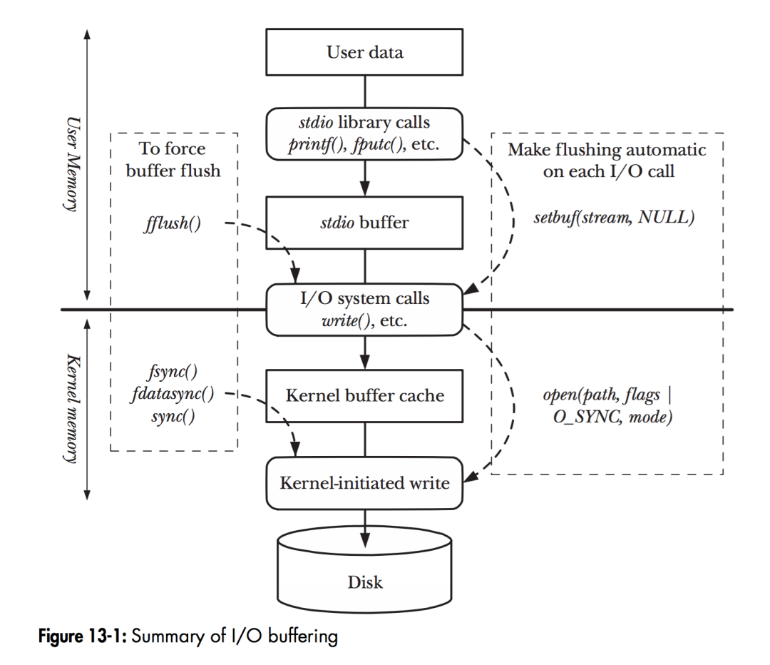 如图,当程序调用各类文件操作函数后,用户数据(User Data)到达磁盘(Disk)的流程如图所示。图中描述了Linux下文件操作函数的层级关系和内存缓存层的存在位置。中间的黑色实线是用户态和内核态的分界线。