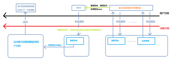 在用户态程序安装SIGIO信号处理函数(用sigaction函数或者signal函数来安装自定义的信号处理函数),即recv函数。然后用户态程序可以执行其他操作不会被阻塞。