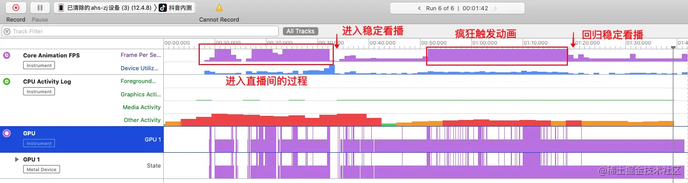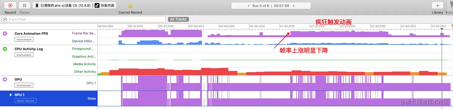 - 临界点有机器性能决定,低端机的临界时间也更短;对于较新机型,很难触及到临界时间,但对于 iPhone 6 来说,复杂的动画如果频率稍高一些,就会导致 GPU、CPU 占用率很快升高。