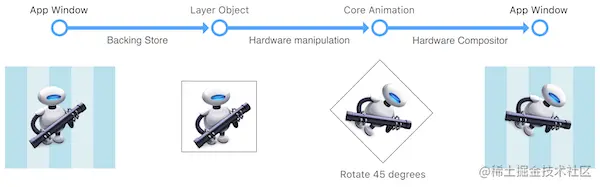 而对比更传统的基于 UIView 重写 drawRect: 的动画实现方式,drawRect: 每一次动画改变都需要依赖新参数进行重绘,这就导致了主线程昂贵的 CPU 消耗。基于 CALayer 的动画就能避免这些消耗,因为 GPU 是直接根据 bitmap 进行绘制,GPU 会对 bitmap 进行缓存,这样能极大地节约 CPU 的性能消耗,提高效率。