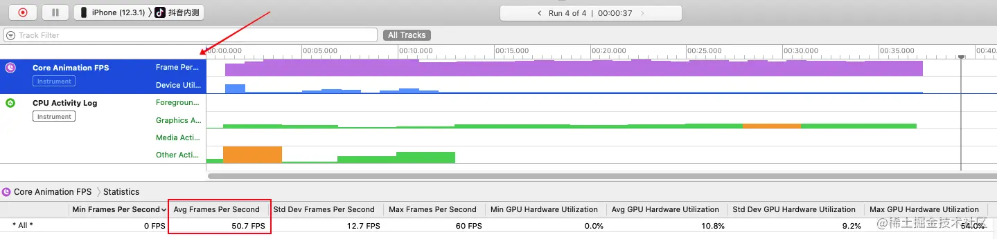 我们使用 Instrument 中 CoreAnimation FPS 选项测出的 FPS 就是 CoreAnimation FPS,如图可以看到,能够通过 Instrument 监测到 avg CoreAnimation FPS,以及 GPU 使用率的情况,可以将这些指标作为帧率优化的结果指标。