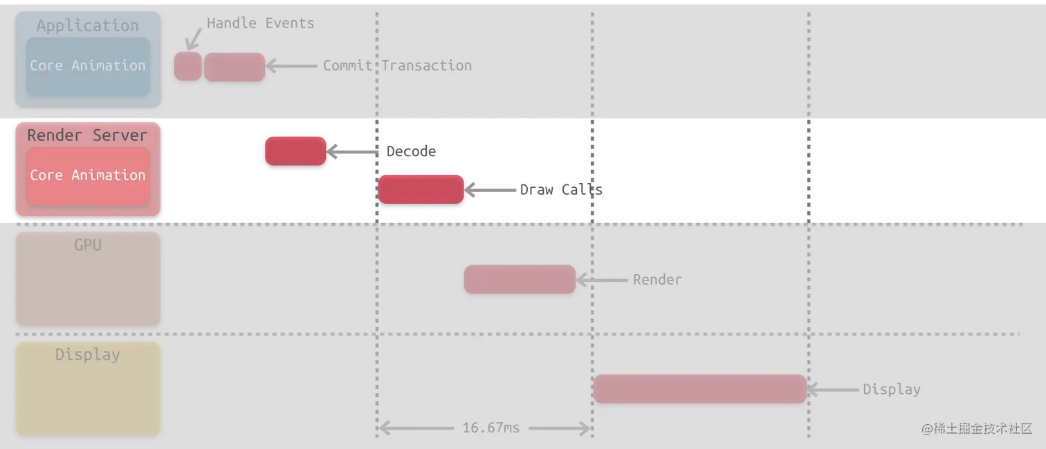 - Render Server - Draw Calls:解码完成后,Core Animation 会调用下层渲染框架的方法进行绘制,进而调用到 GPU。