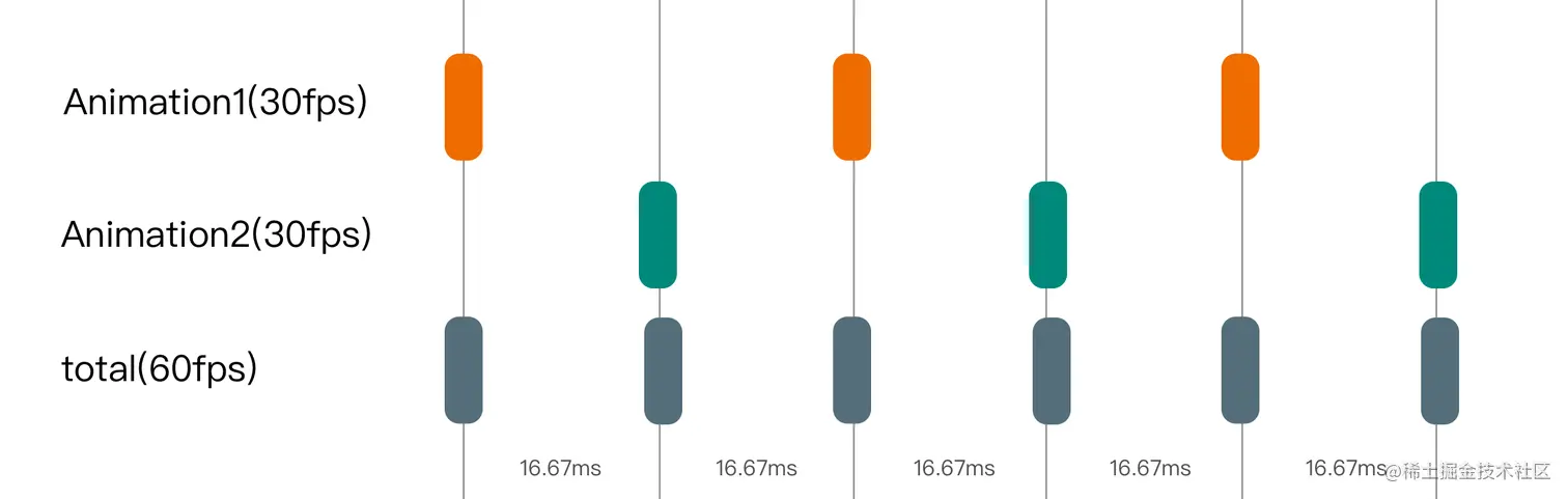 另一种基于 CADisplayLink 的情况的好处在于可以精准控制多个动画触发时间。如果有多个低帧动画同时进行,但是这些低帧动画的刷新时刻不一定是同时触发的,那么整体来看有可能就会造成降帧效果不佳的情况(极端情况比如上图,两个 30 帧动画同时进行却刚好错开,造成 60 帧的效果)。这时通过 CADisplayLink 就能够精准地控制多个动画的刷新时刻,保证降帧的效果。