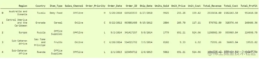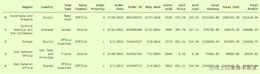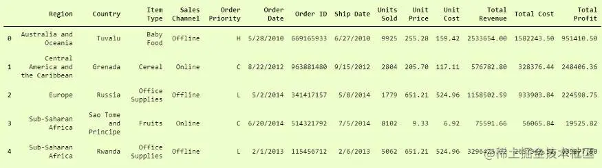 我们将使用数据集,即第一个示例中使用的数据集“ 100 Sales Records.csv”,以证明其中可以包含多种数据类型。