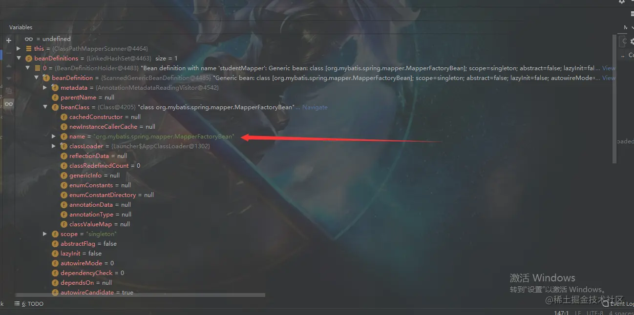 12:进入this.processBeanDefinitions(beanDefinitions);方法,其实这个方法就是MyBatis会mapper层接口生成代理类的关键了,可以看到处理之后我们的BeanDefinition编号才能了MapperFactoryBean。这个到底有什么用呢??我们只需要记住一点,等真正实例化Bean的时候,也就是在AbstractBeanFactory的doGetBean方法中,只要是实例化mapper下的接口返回的都是MapperFactoryBean,因为Spring在实例化bean都是先获取Bean对用的BeanDefinition之后,根据BeanDefinition进行实例化Bean。扯远了哈,,,,,所以你只需要记住这个方法的作用就是改造你的mapper接口下的Bean。然后注册进Spring容器中