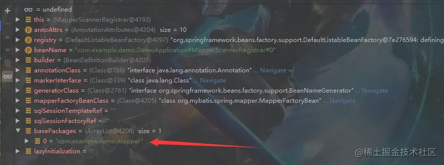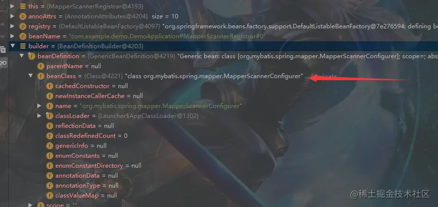 8:在第7步我们设置好了我们mapper接口所在的包路径,然后就会去注册一个Bean了,重点来了!!!!,注册的这个Bean是什么??从图中可以看到是MapperScannerConfigure,记住不是MapperScannerResistar这个类,不要搞错了