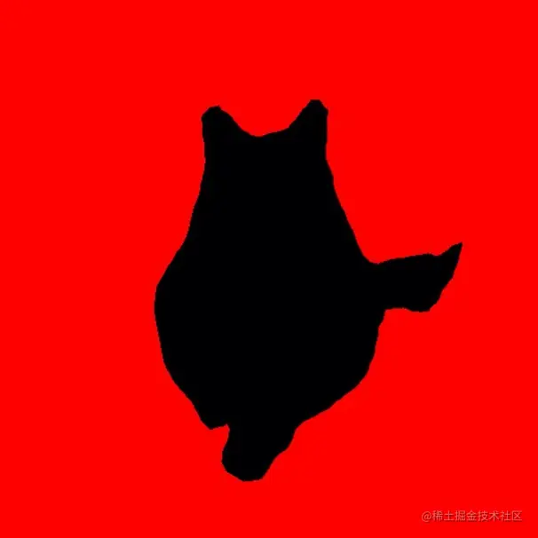 根据实际情况,比如目标物体是猫,那么属于猫的部分就是黑色,非猫的部分是红色,那么这样最终输出的Bitmap就是: