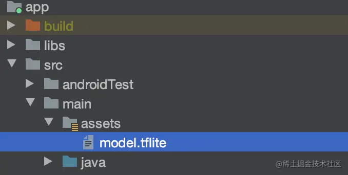 最后,我们将tflite文件(这里命名为model.tflite),将这个文件移动到项目model下的 src/main/assets 目录下,如图: