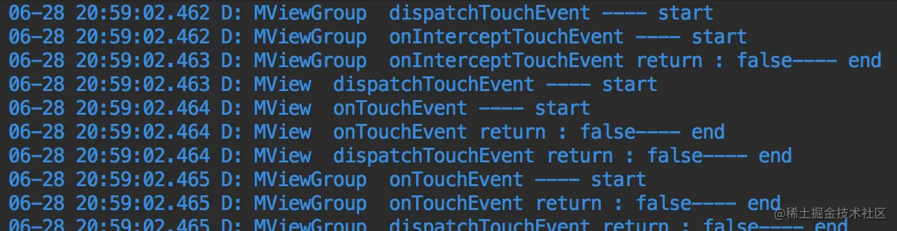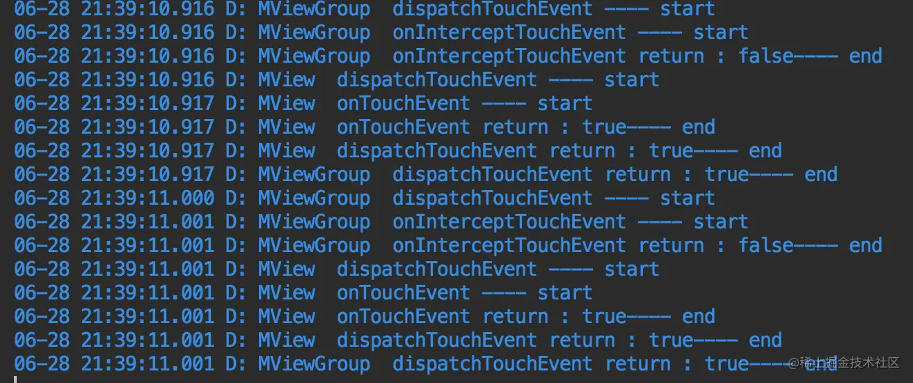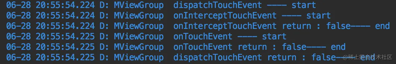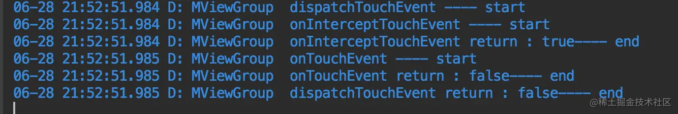 最后,我在上一步的基础上,给ViewGroup的onInterceptTouchEvent()方法返回值强行改为true,表示事件传到这一层的时候就被拦截了,看一下log: