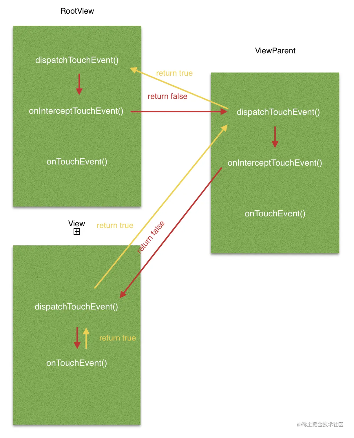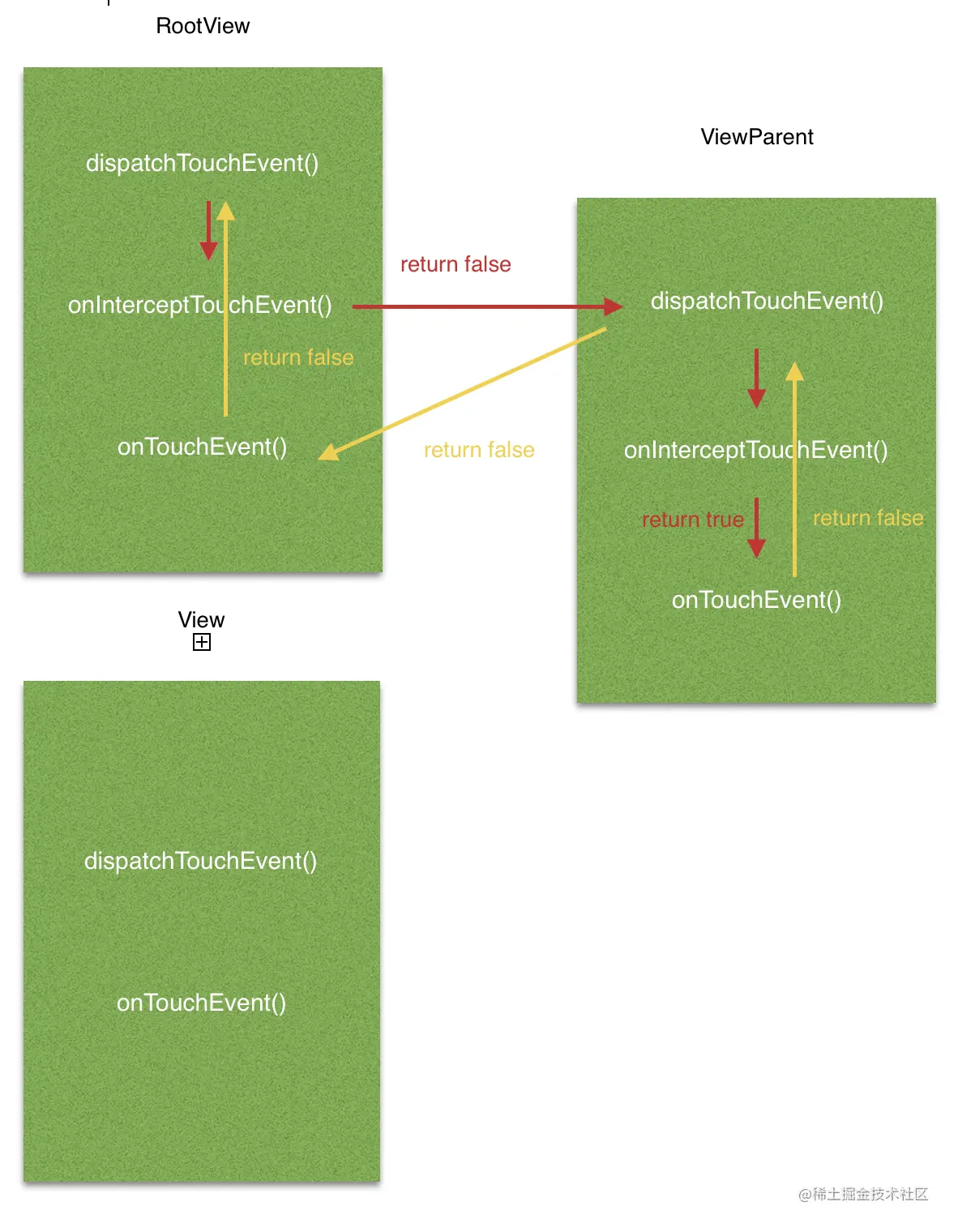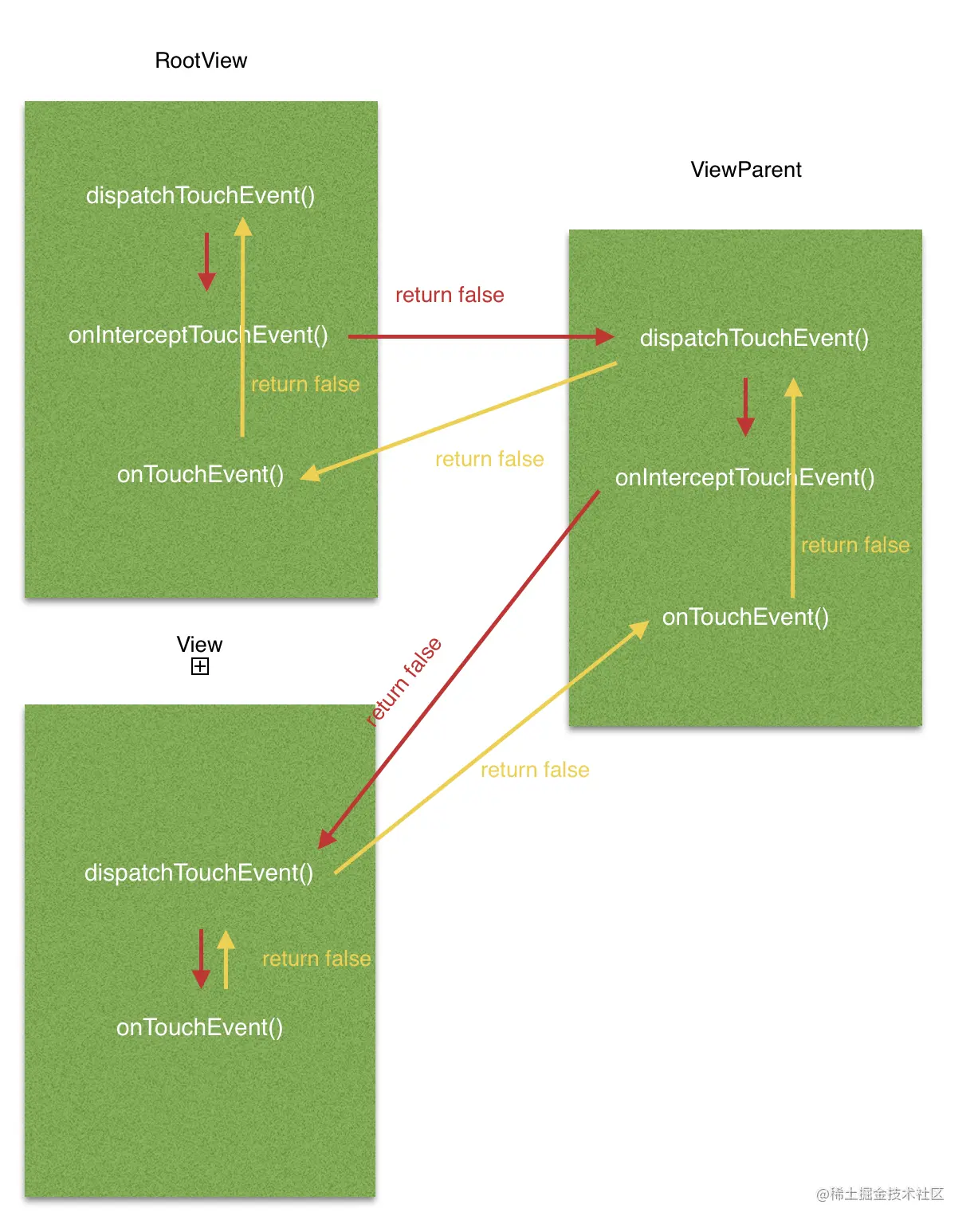 可以看到,事件分发首先由ViewGroup的dispatchTouchEvent()方法开始,先调用自己的onInterceptTouchEvent()方法判断是否拦截,返回false表示自己没有拦截,那么接下来直接把事件传给子View。子View调用自己的dispatchTouchEvent()方法进行分发,因为View没有onInterceptTouchEvent()方法,所以不存在拦截操作,因此直接将事件交给自己的onTouchEvent()方法消费。因为我的子View没有使用这个事件,因此onTouchEvent()方法直接返回了false表示自己没有消费,那么这个事件此时就算是传到底了。因为自己没有消费,因此自己就没有分发出去,那么子View的dispatchTouchEvent()方法返回false,把这个事件交还给上一层的ViewGroup。ViewGroup发现这个事件没有子View消费,那么就自己动手吧!将事件传给自己的onTouchEvent()方法消费。可是ViewGroup也没有消费,那么onTouchEvent()方法只能是再返回false了。同理,ViewGroup自己没有消费事件,因此他的dispatchTouchEvent()方法也返回了false。这段文字说得可能有点乱,那么就贴一张图来演示一下:(图中红色箭头表示事件自顶向下分发的过程,黄色则表示自底向上返回的过程)