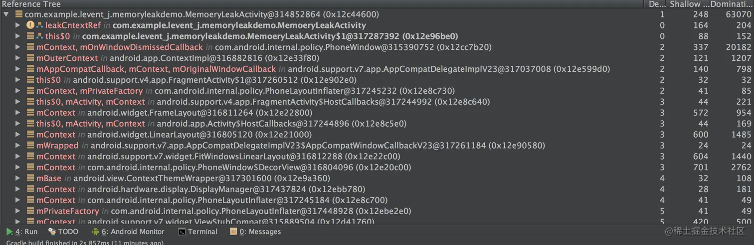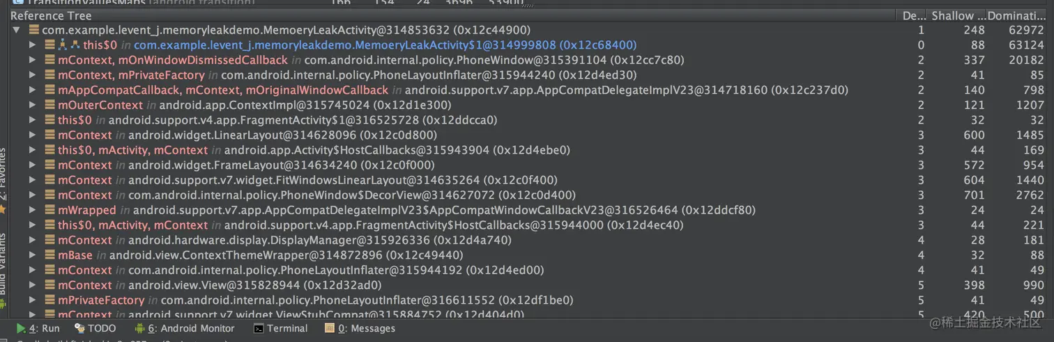 一般来说,第一个就是我们发生泄漏的地方。在图中,this$0的意思是隐式的引用。也就是说,我们的activity是因为一个内部类而发生了内存泄漏。