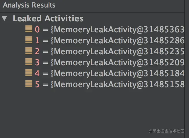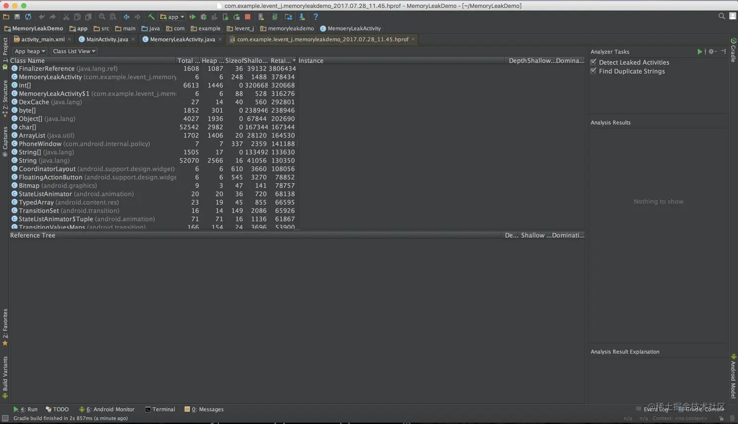 如图在这个界面中,我们看最右面有一个栏叫 Analyzer Tasks,打开它,会发现有两个选项。我们是来看activity的内存泄漏的,那就把那个查重复字符串的√去掉。然后点右边那个绿色小三角,会发现下面Analysis Results栏里面展示出了当前泄露的Activity引用:
