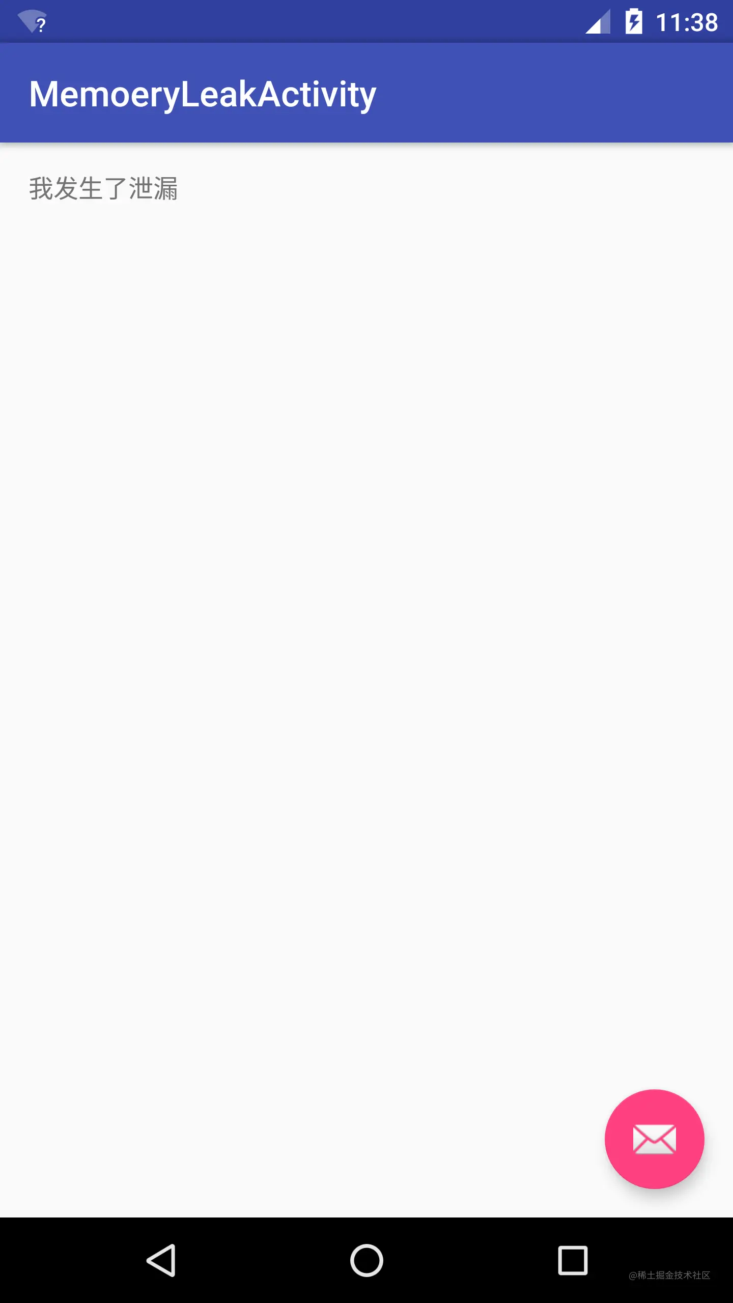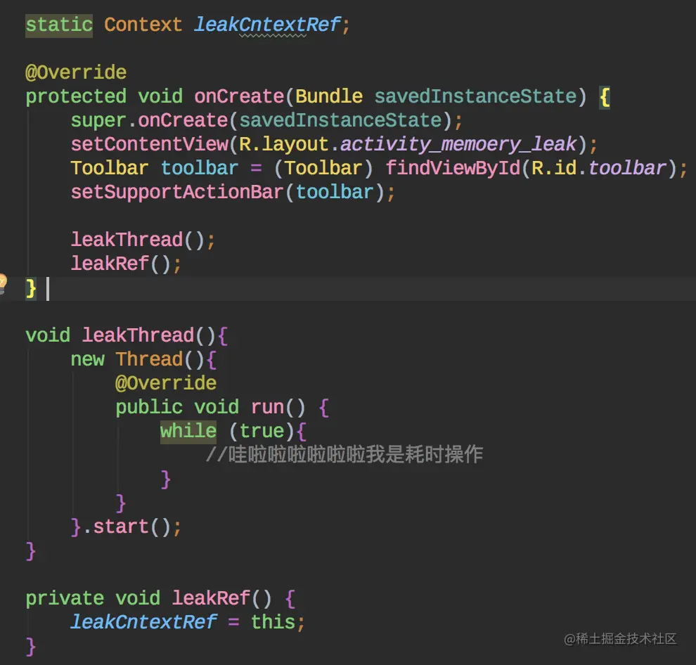 首先,我写了两个activity,一个MainActivity,一个MemoryLeakActivity,逻辑是:MainActivity中有个按钮,点击会调到MemoryLeakActivity,在这个activity中会故意发生内存泄漏,代码如下: