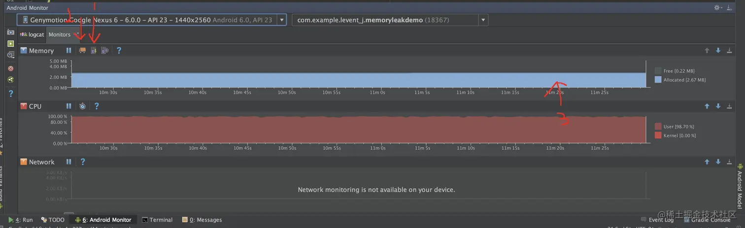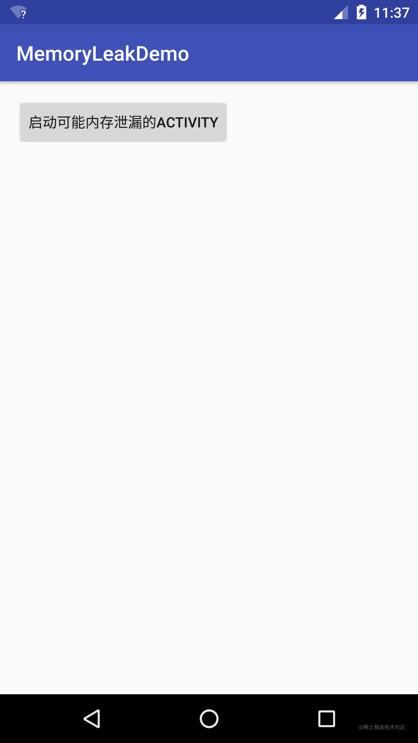 好了,介绍完这个工具,我们开始动手实践。首先打开app,点击按钮跳到会发生泄漏的activity上,再按返回键,然后再次按下按钮……这样反复操作: