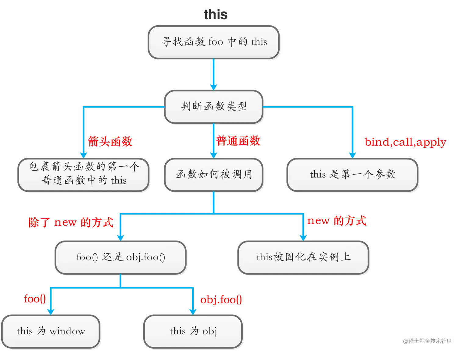 首先,new 的方式优先级最高,接下来是 bind 这些函数,然后是 obj.foo() 这种调用方式,最后是 foo 这种调用方式,同时,箭头函数的 this 一旦被绑定,就不会再被任何方式所改变。