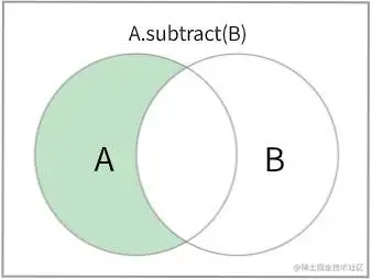 subtract 方法会得到所有存在于集合 A 但不存在于集合 B 的元素。我们首先创建一个新的集合变量 subtractionSet 来存放差集结果。通过 this.values() 拿到集合A 中的所有值,然后迭代集合 A 中的所有值,将存在于集合A 但不存在于集合B 中的元素放入 subtractionSet 集合中,迭代完集合 A 中的所有元素后,subtractionSet 集合中的元素就是集合A 与集合B 差集。