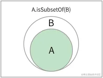 isSubsetOf 方法验证 集合 A 是否是 集合 B 的子集。我们首先需要验证当前 Set 实例的大小(集合A),如果当前实例中的元素比 otherSet 实例(集合B)更多,说明当前 Set 实例不是 otherSet 的子集。(子集的元素个数需要小于等于要比较的集合)。