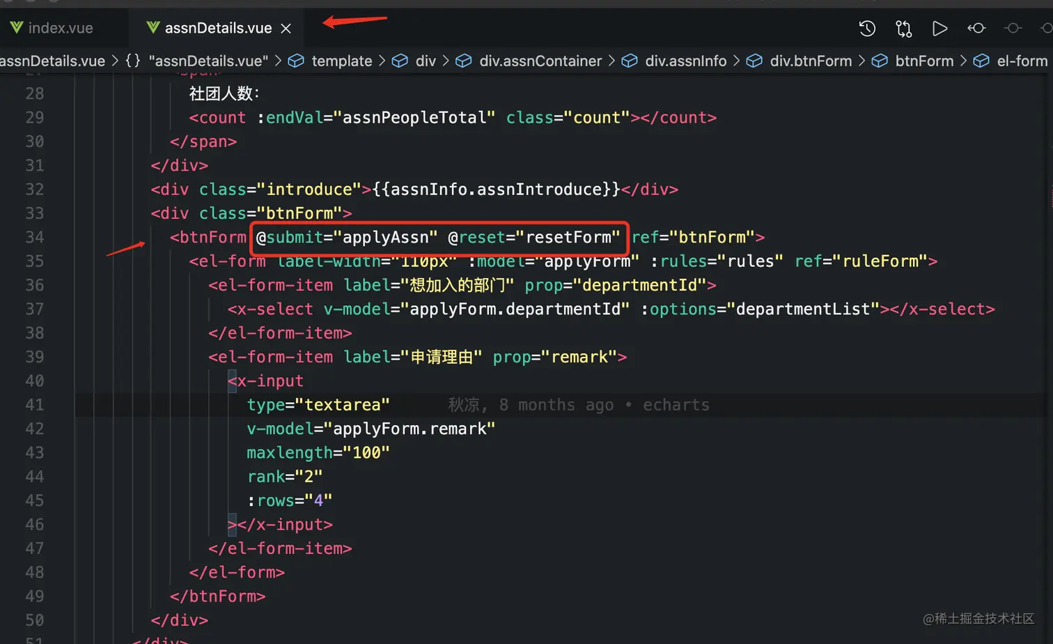 在这里,我们在 assnDetails 组件中定义了一个 btnForm 组件在上面使用 v-on 来监昕了自定义事件 submit 和 reset。