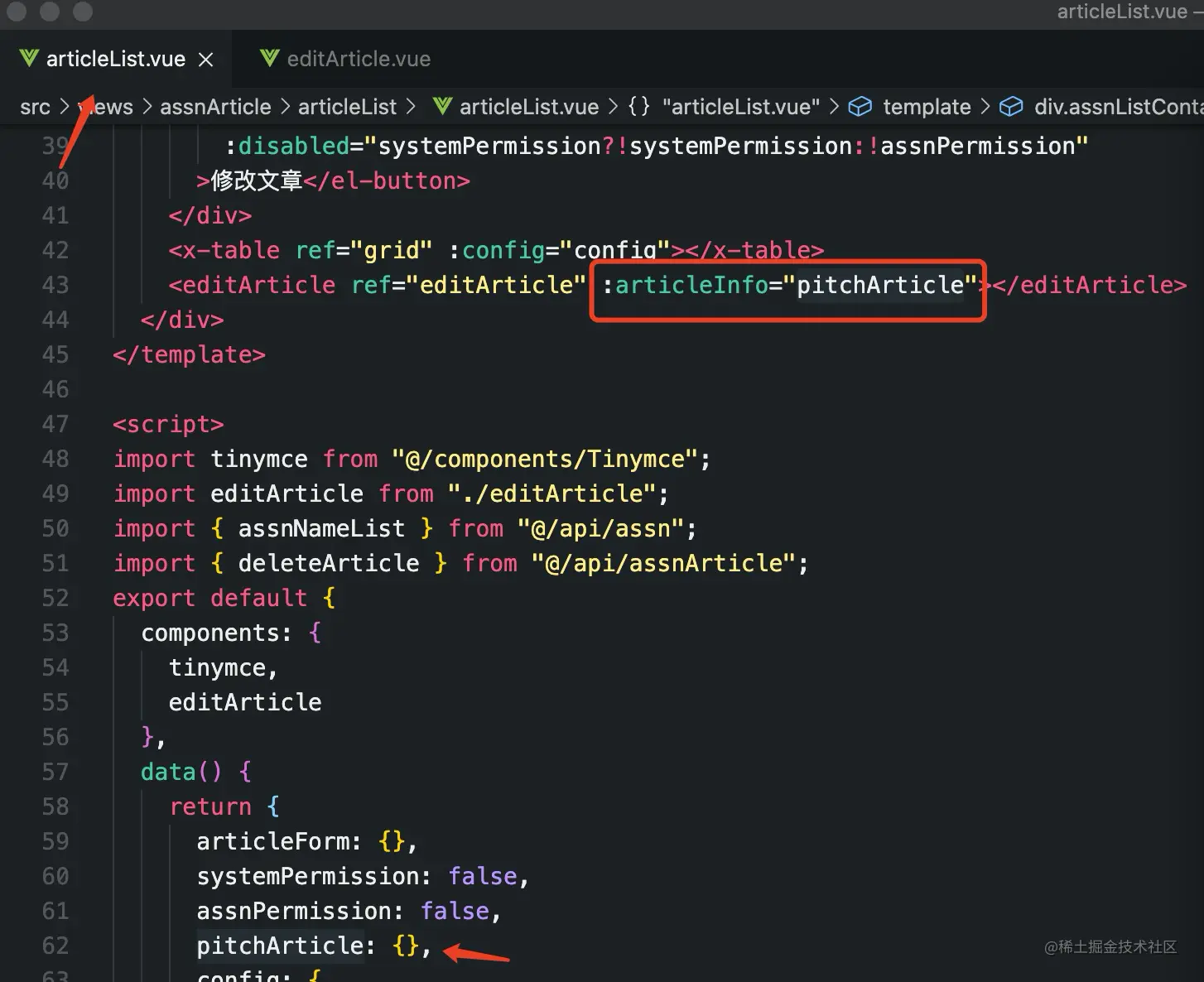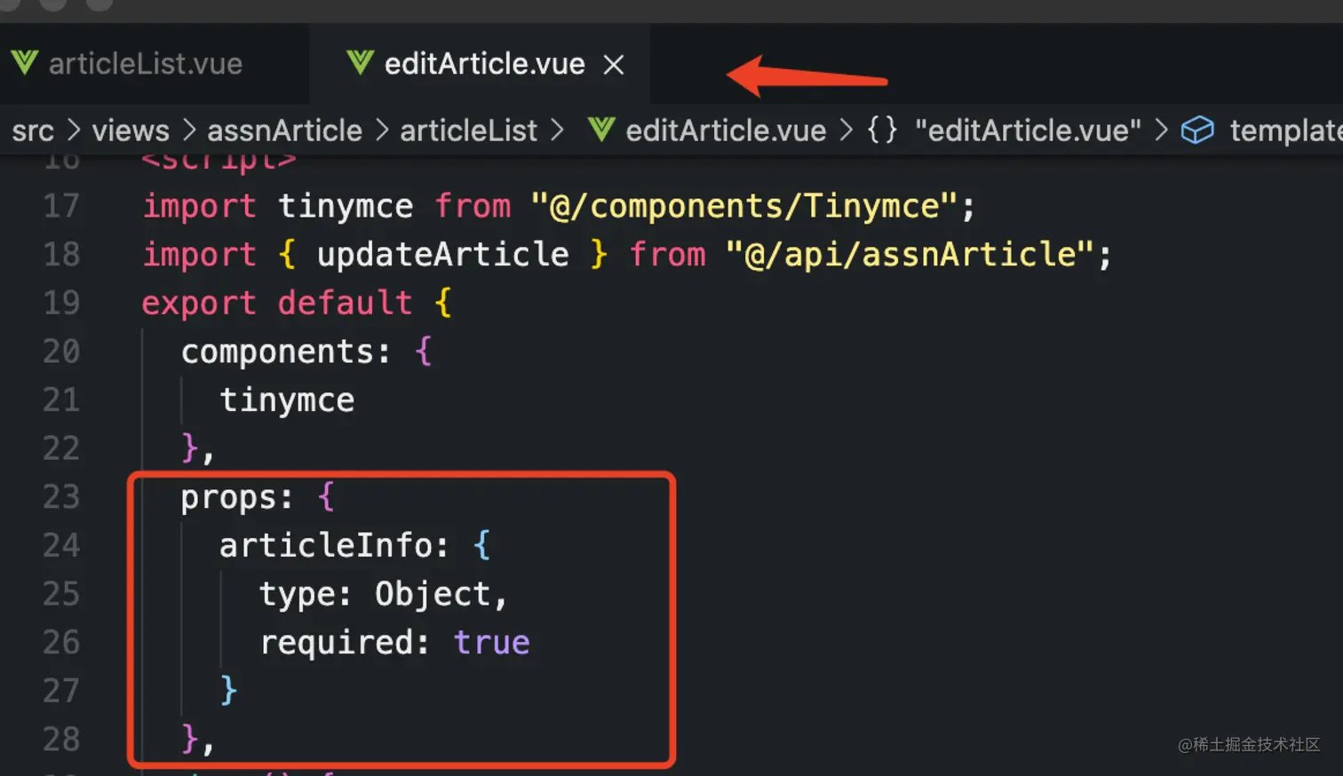 articleList 是我们的父组件,而 editArticle 是我们的子组件。我们在 articleList 父组件中使用了 editArticle 组件的实例,并且传递了 articleInfo 这个参数。然后我们在editArticle 组件中 props 处进行了接收。