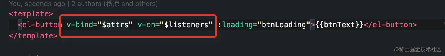这是我们定义的一个按钮组件,但是我们也想使用 Element 按钮组件的相关东西,但是 Element 按钮组件的属性以及事件非常多,我们一个个传递十分麻烦,有没有什么一劳永逸的方法呢?$attrs、$listeners就是用来解决这个问题的,它可以把我们自定义的组件上设置的属性以及事件一起丢给 Element 组件。我们还可以对它进行一次拦截,给它设置默认值等等。这是我们后续经常会用上的属性。
