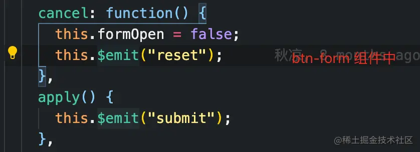 然后我们在 btnForm 组件进行相关的触发事件,第一个方法 cancel 方法触发 reset 自定义事件,第二个方法 apply 方法触发 submit 自定义事件(当前cancel、apply都在本页面都是通过按钮点击触发,你也可以设置其他的,这里并不重要)。