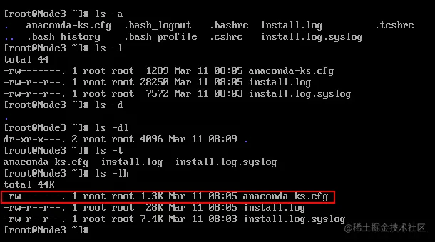 上面我们分别列出了ls的各种命令组合显示效果。我们以 -rw-------. 1 root root 1.3k Mar 11 08:05 anaconda-ks.cfg 为例解析每个字段: