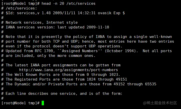 例子:显示 etc目录下的 services 文件前面 20 行 head -n 20 /etc/services