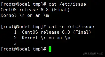 例子:通过不加参数-n和加参数-n,显示/etc/issue的内容