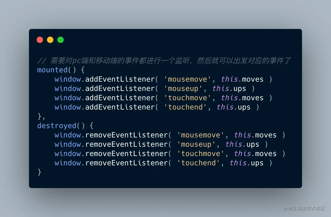 最后,我们需要对这两个事件进行一个监听和销毁,也就可以在钩子函数中添加两个监听事件,来收尾我们这次的工作。