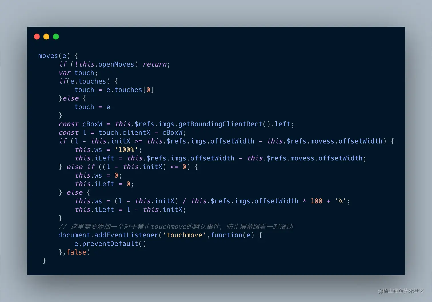 我们这样就可以计算出,到底是鼠标还是手指的移动距离,和我们需要的距离是否相等,就判断出是否滑动到位啦,怎么样,是不是很简单?!另外这里要注意一点,就是移动过程中,需要添加一个阻止默认事件,避免屏幕跟随滑动。
