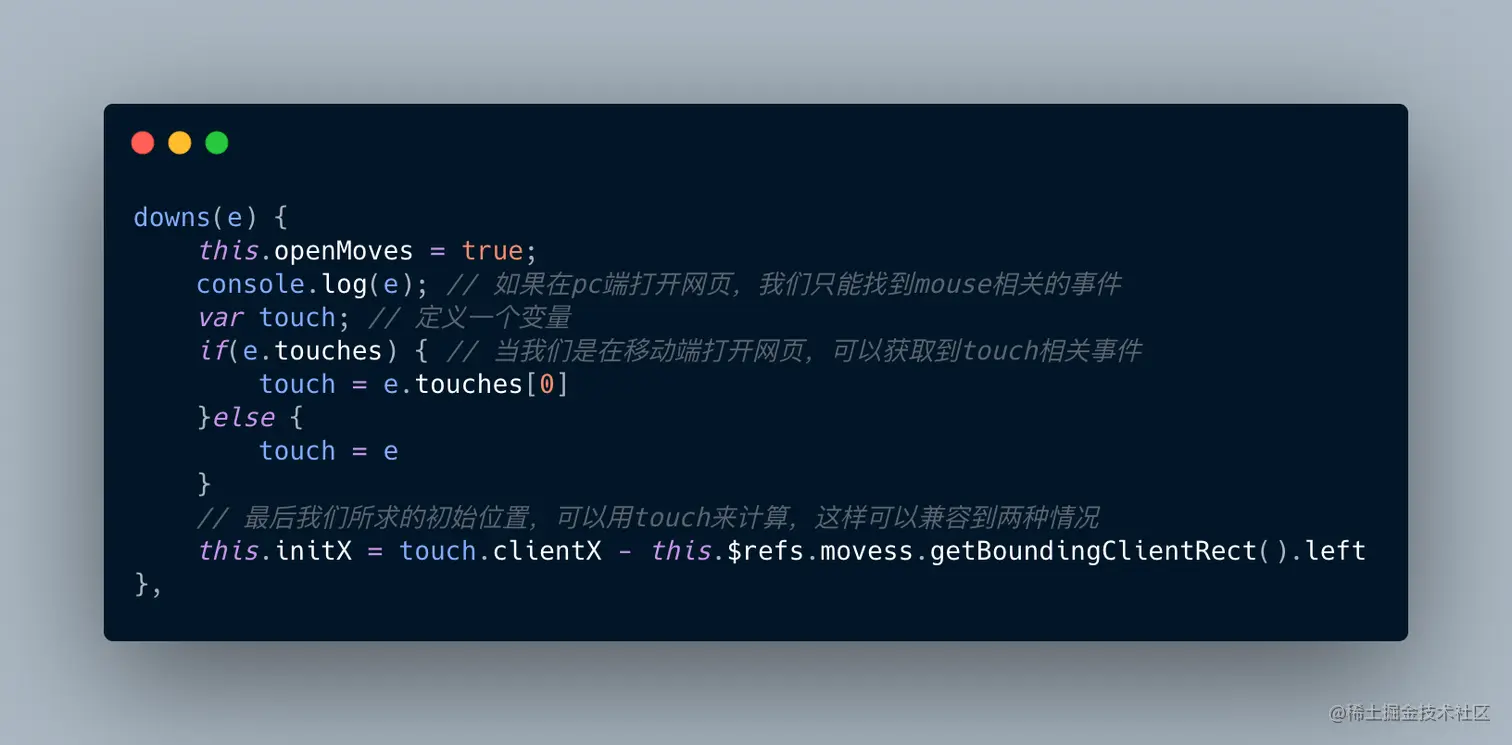 绑定完事件之后,自然是定义事件啦,那定义事件的时候,我们就需要来削微的判断一下,到底是mouse还是touch。