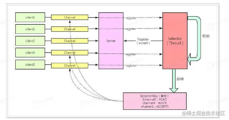 Selector不断轮询其上面的Channel,Channel发生读或者写,就会被Slector挑选出来。然后通过SelectionKey获取就绪Channel集合,进行IO读写操作。