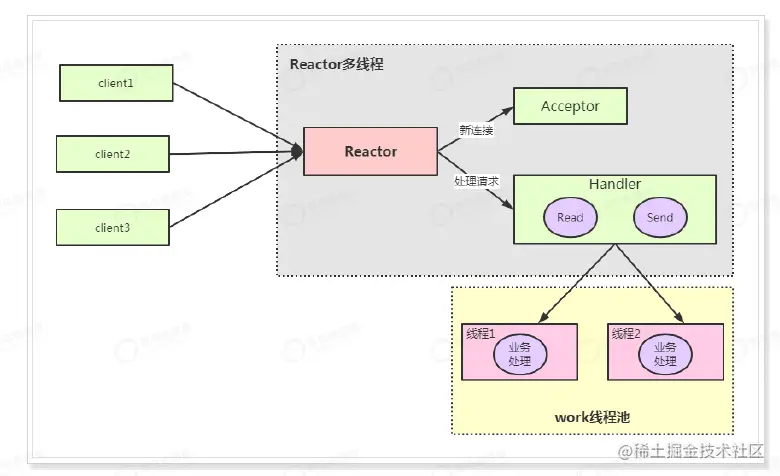 相对于单线程而言,不同点在于,Handler只负责用户响应和事件分发。真正业务逻辑在work线程池中处理。