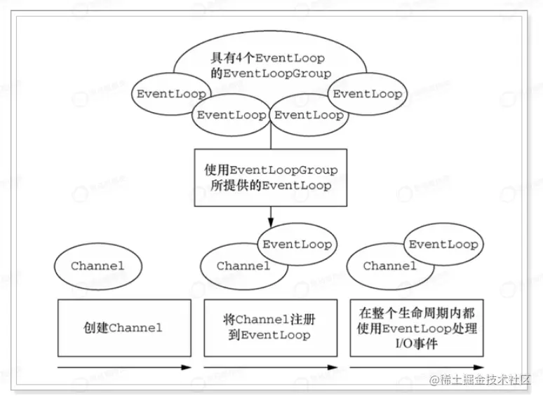 c Handler 将自身和事件绑定,执行读写操作(完成channel的读入,执行业务逻辑并将结果写道channel)。
