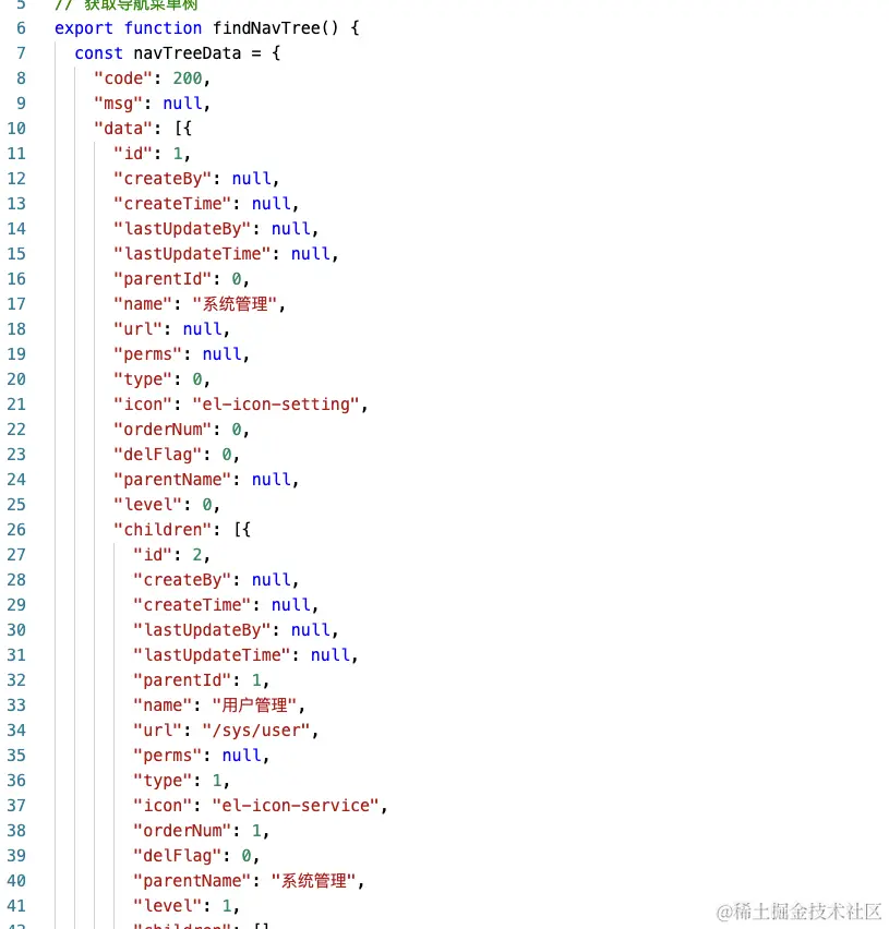 通过服务端配置获取菜单,这里使用MOCK来模拟服务端的数据,数据如下,数据很长,先用看图片讲逻辑,再最后我把完成数据贴出来