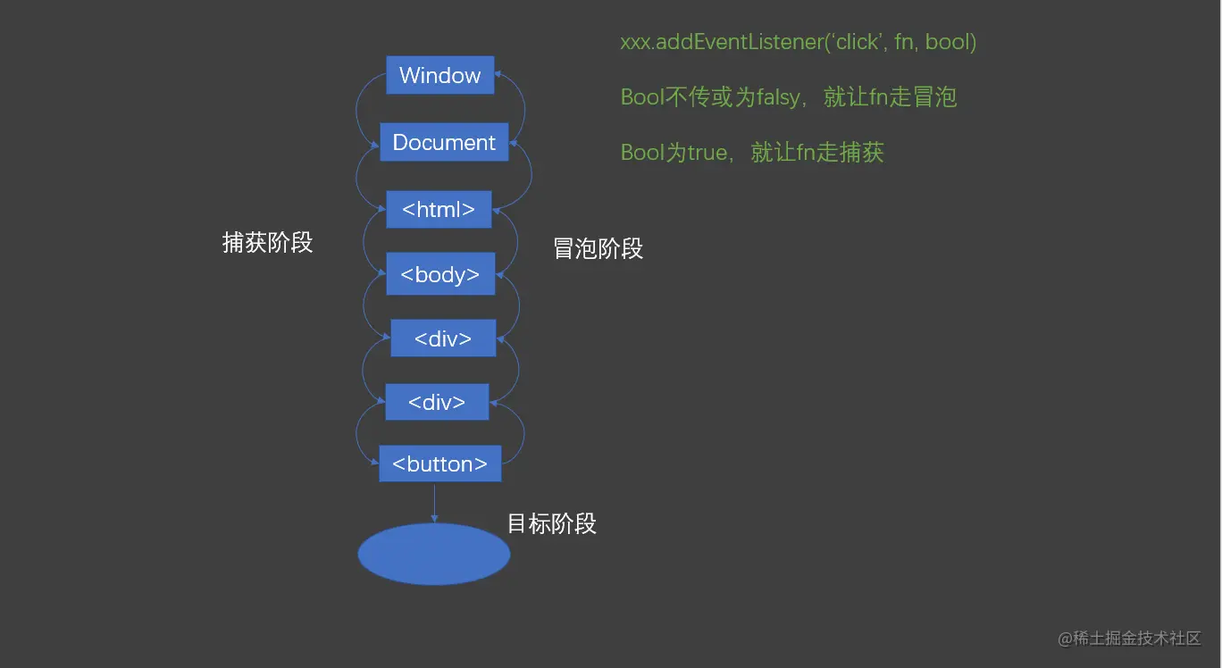 如果bool为true就让fn走捕获 即当浏览器在捕获阶段发现xxx有监听函数 调用fn并提供事件信息