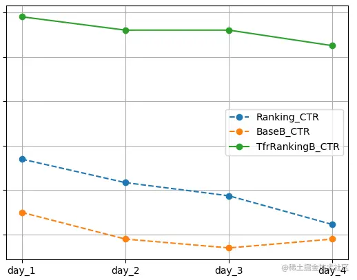 究竟 TFR 框架训练的 LTR 排序模型对比同样网络结构的原生模型,能够带来多大的效果提升呢,我们也专门做了线上实验来分析。选取了一个业务场景,取出三个流量组分别做以下模型: